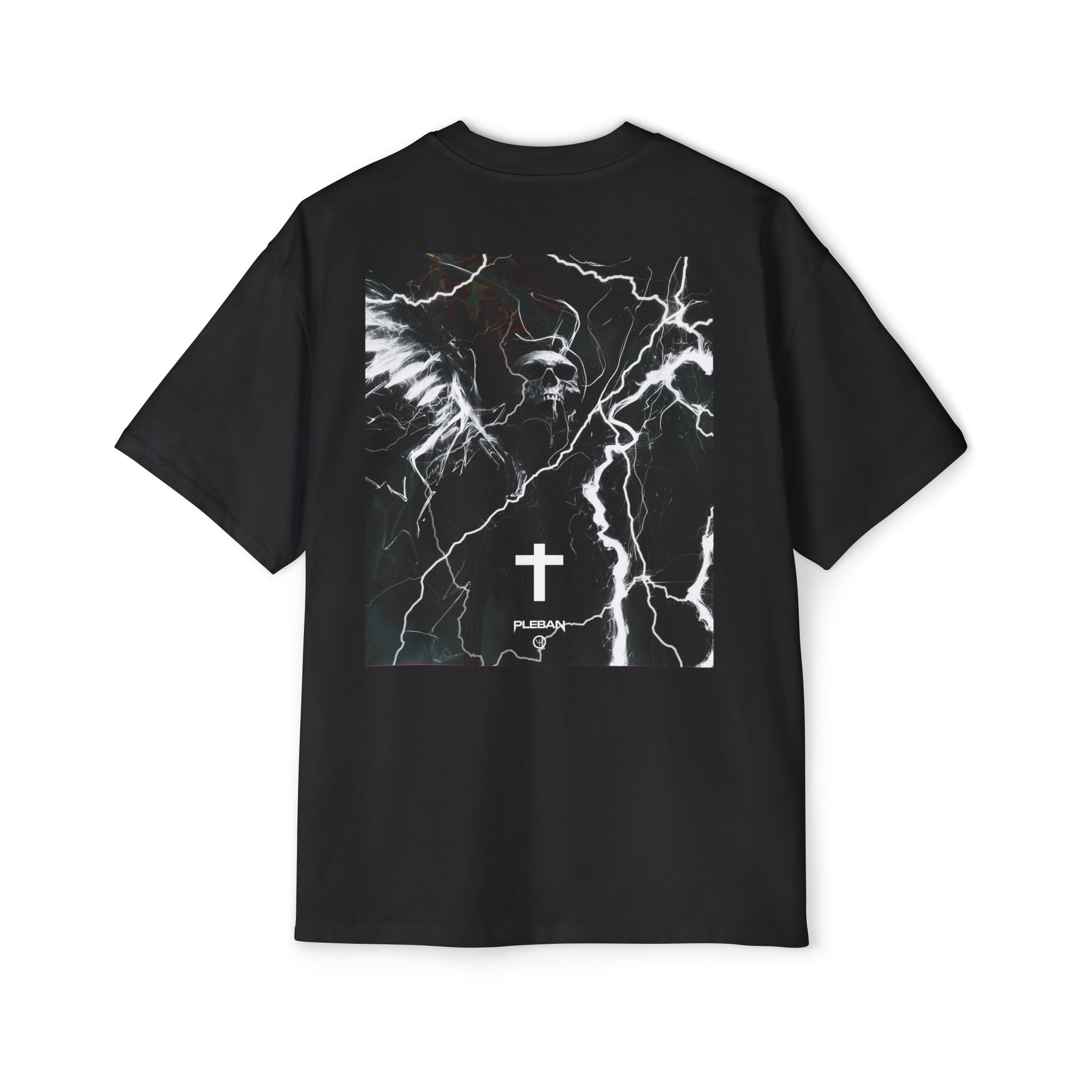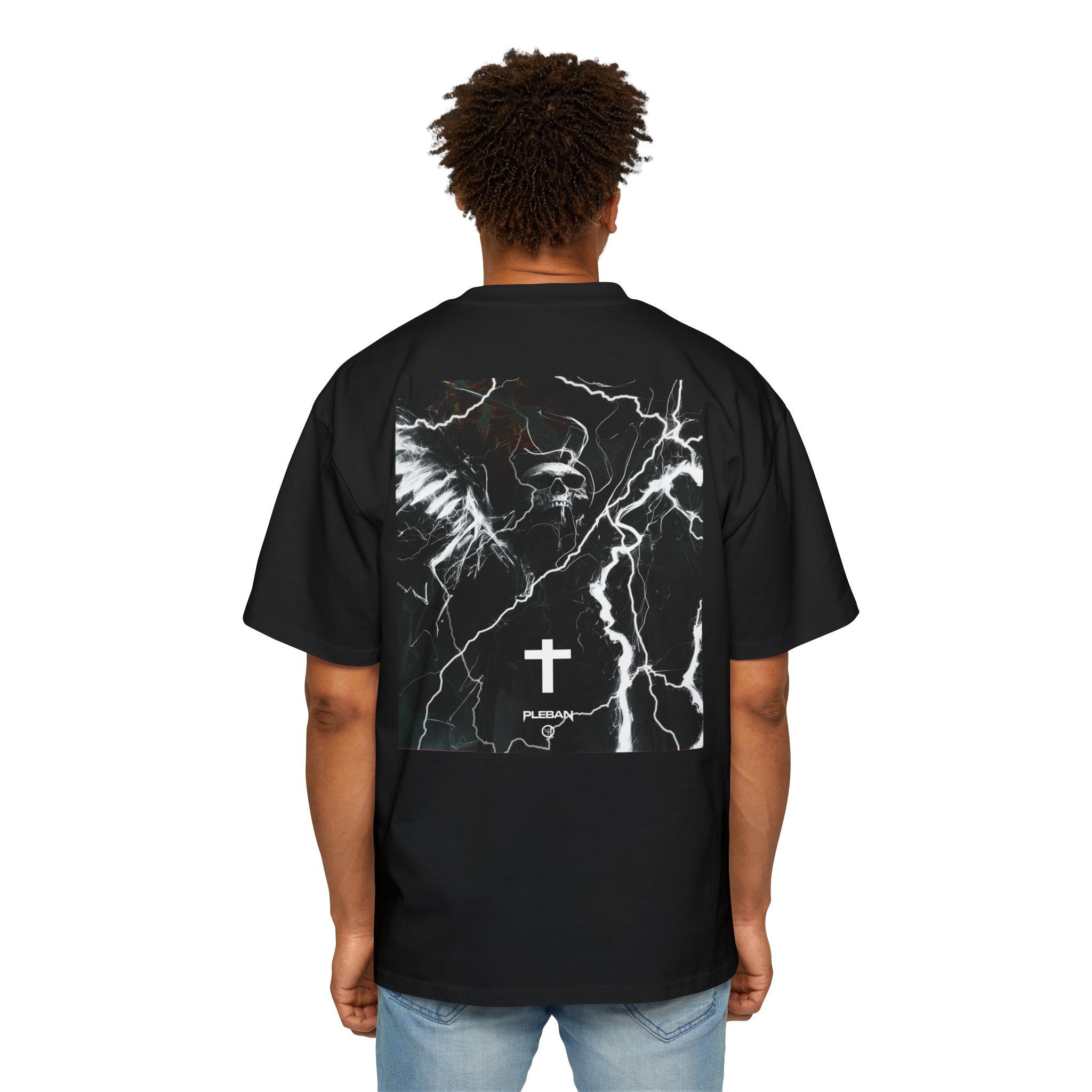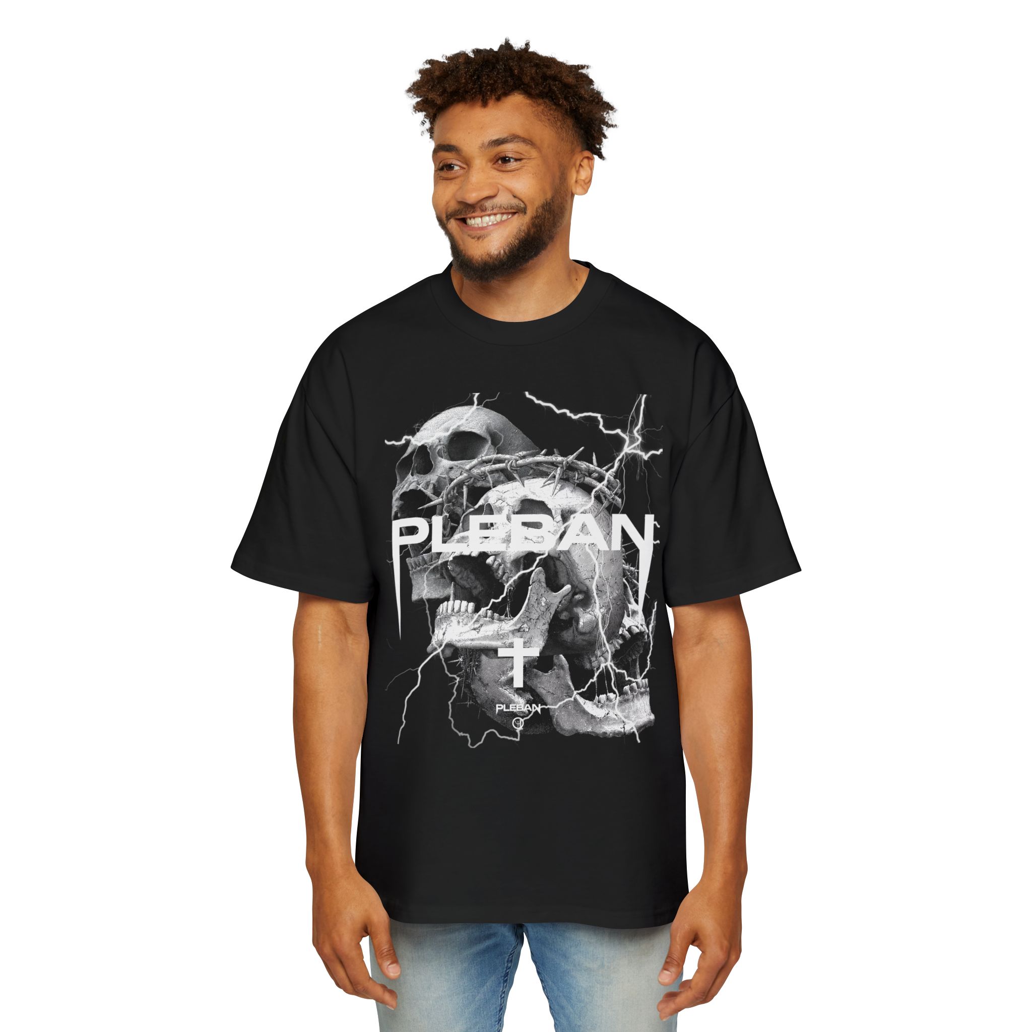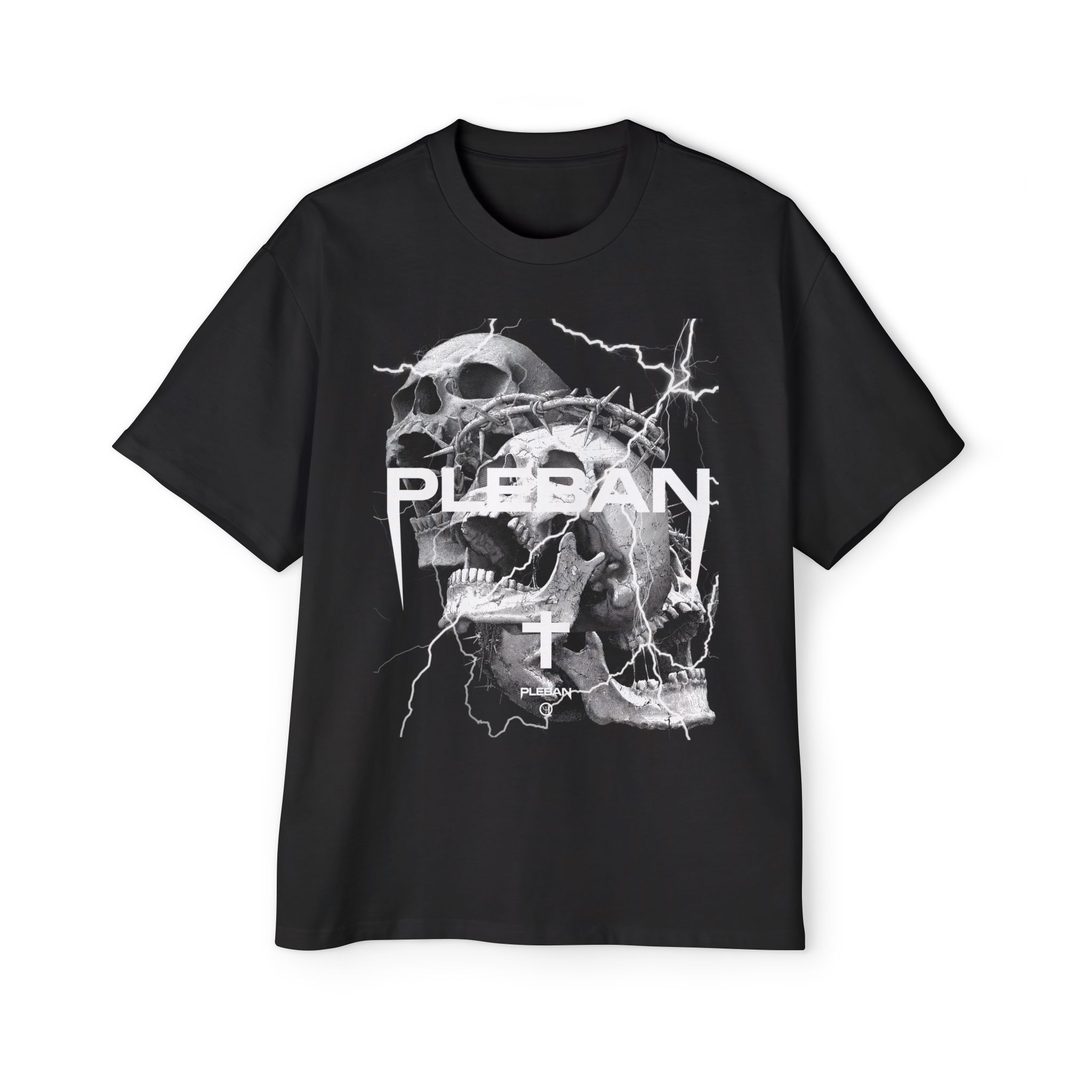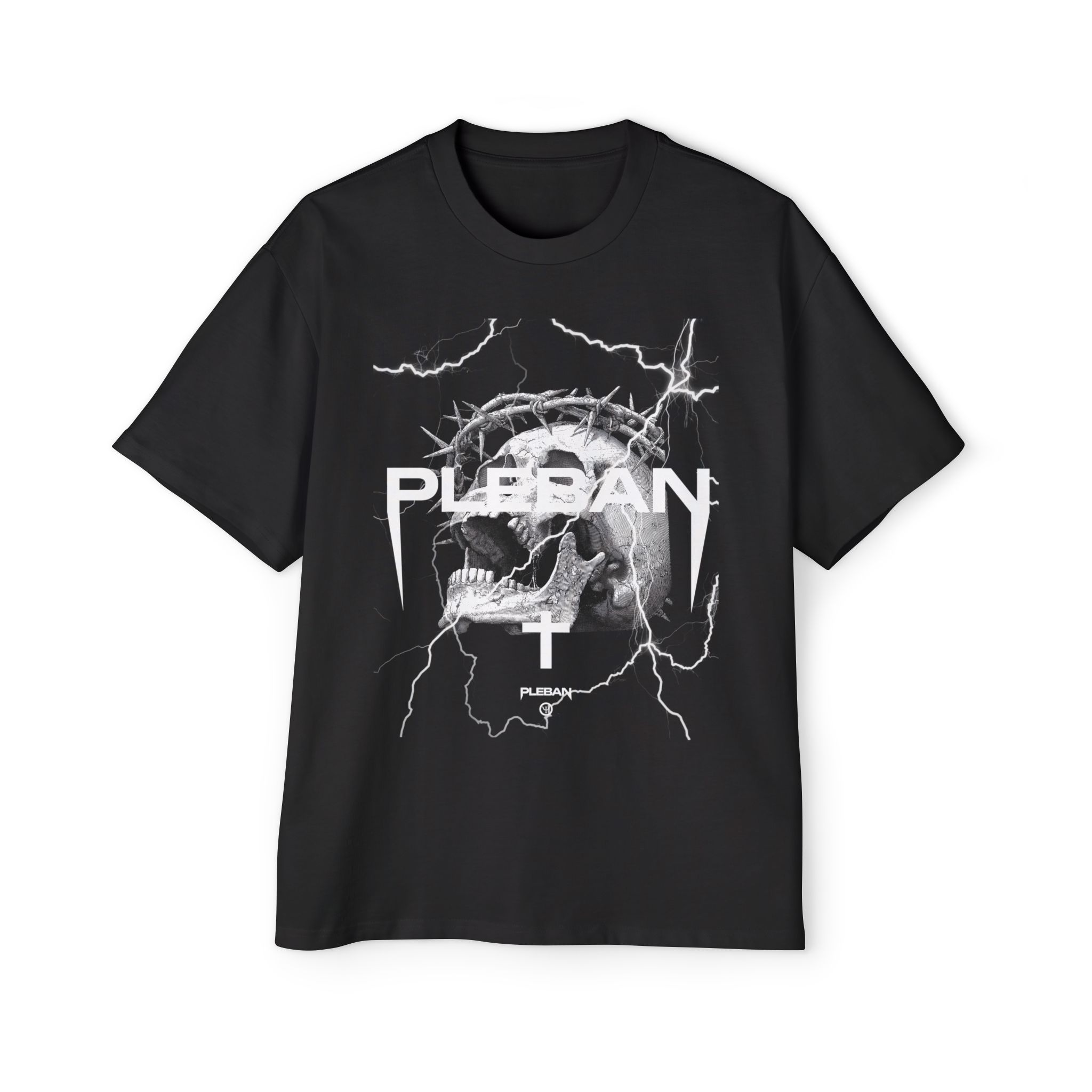 An oversized tee built for boldness — heavy-weight carded cotton that hangs with deliberate slouch and holds its shape. The front and back graphics lean into dark, stormy energy: a snarling skull, jagged lightning strikes and a stark inverted cross framed by the raw, blocky PLEBAN wordmark. It reads like a midnight mosh; worn loose over jeans or layered under a leather jacket, this shirt carries a charged, rebellious mood without shouting. The substantial fabric and reinforced stitching mean it wears like a lived-in favorite, not a fragile statement piece. If you move through underground shows, late-night city streets, or creative scenes that prize grit and attitude, this tee slips into that story and amplifies it.
