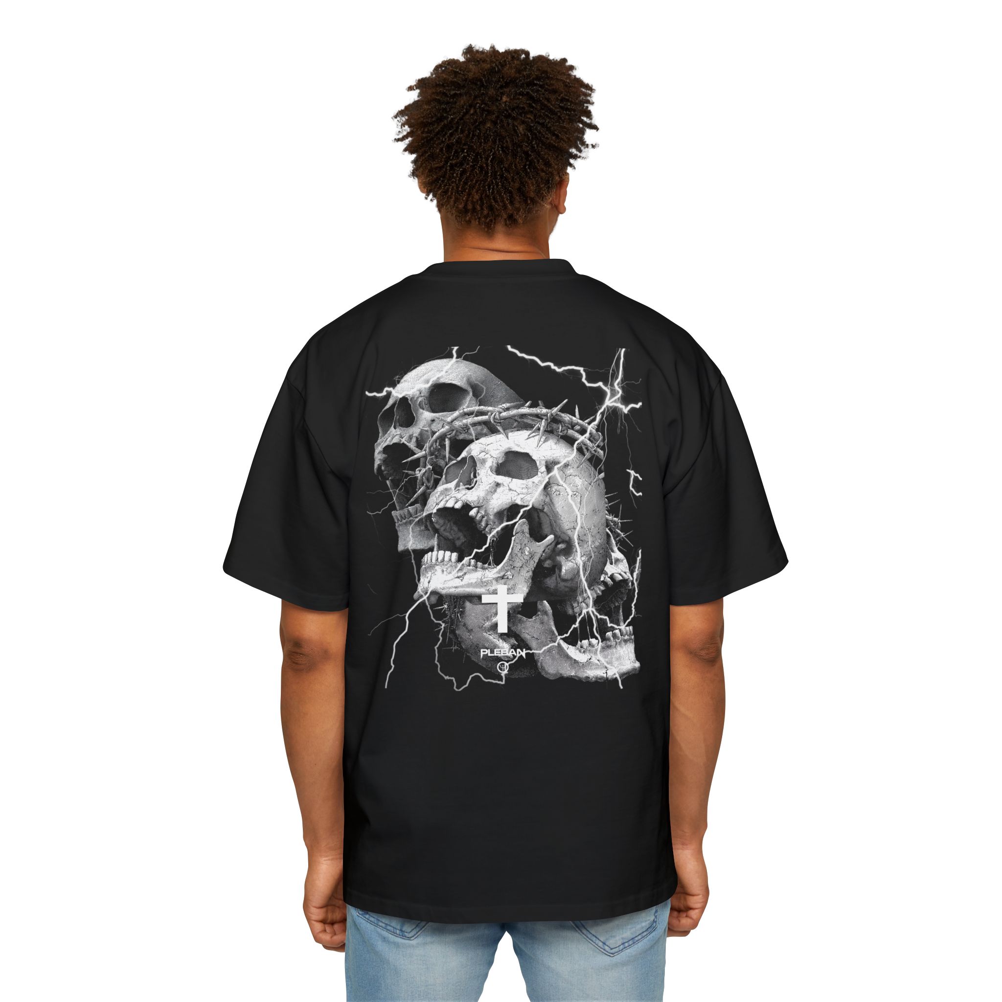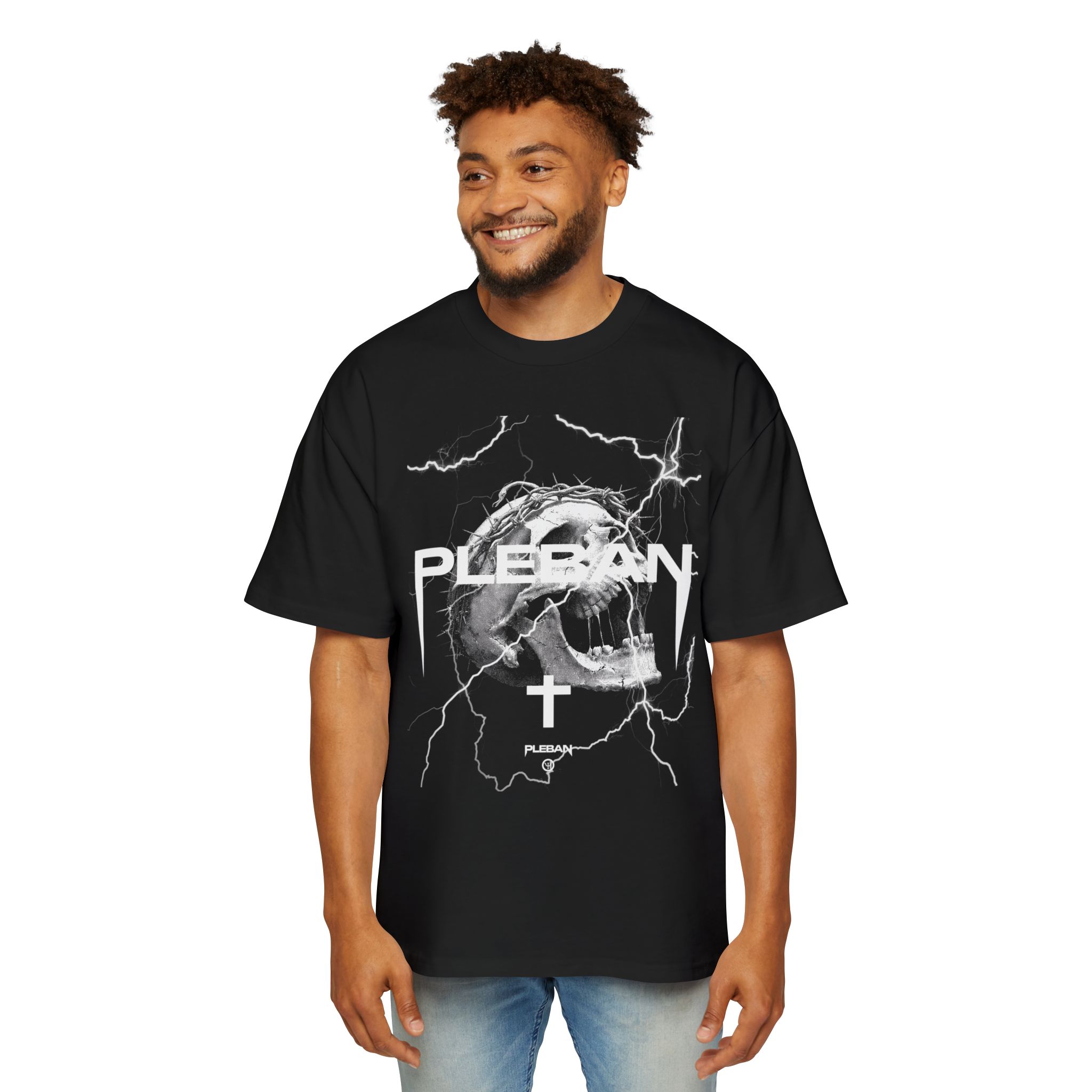 An oversized tee built for boldness — heavy-weight carded cotton that hangs with deliberate slouch and holds its shape. The front and back graphics lean into dark, stormy energy: a snarling skull, jagged lightning strikes and a stark inverted cross framed by the raw, blocky PLEBAN wordmark. It reads like a midnight mosh; worn loose over jeans or layered under a leather jacket, this shirt carries a charged, rebellious mood without shouting. The substantial fabric and reinforced stitching mean it wears like a lived-in favorite, not a fragile statement piece. If you move through underground shows, late-night city streets, or creative scenes that prize grit and attitude, this tee slips into that story and amplifies it.