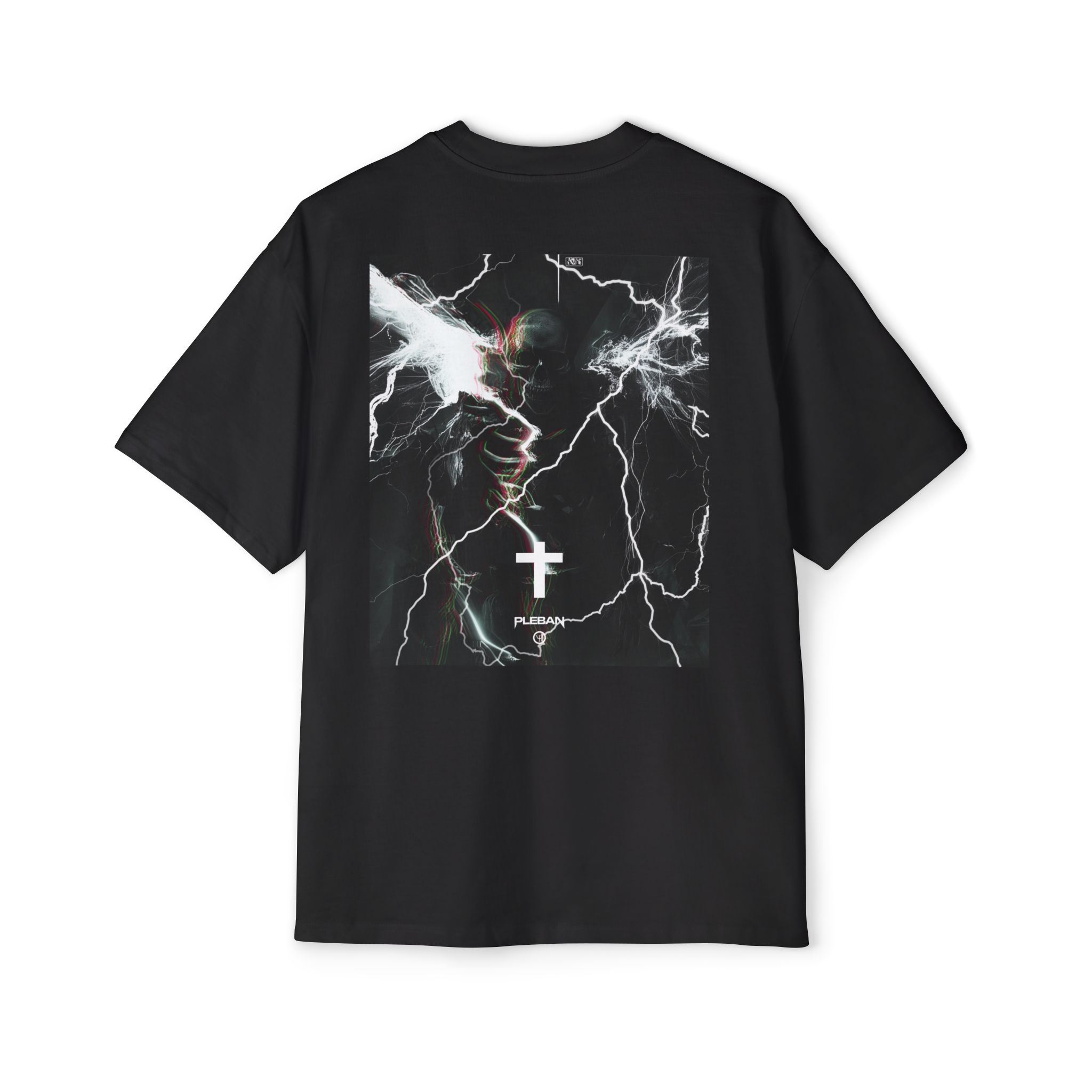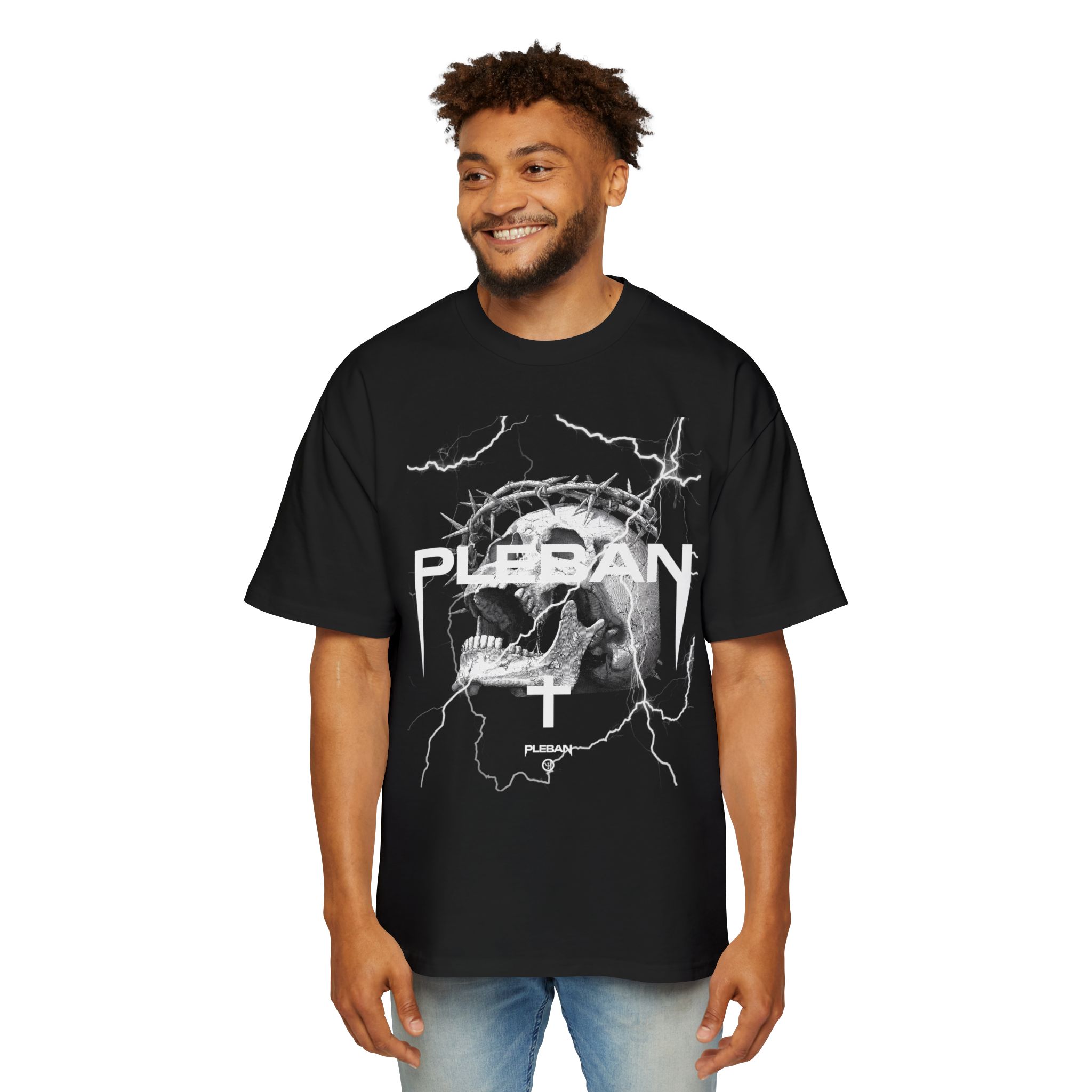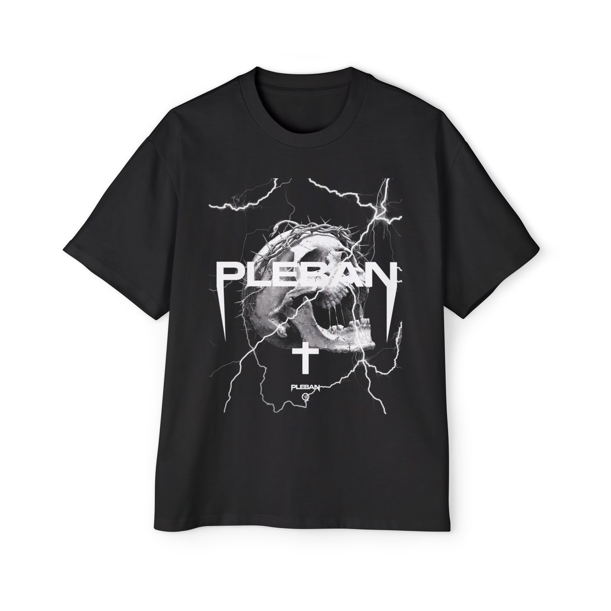 An oversized tee built for boldness — heavy-weight carded cotton that hangs with deliberate slouch and holds its shape. The front and back graphics lean into dark, stormy energy: a snarling skull, jagged lightning strikes and a stark inverted cross framed by the raw, blocky PLEBAN wordmark. It reads like a midnight mosh; worn loose over jeans or layered under a leather jacket, this shirt carries a charged, rebellious mood without shouting. The substantial fabric and reinforced stitching mean it wears like a lived-in favorite, not a fragile statement piece. If you move through underground shows, late-night city streets, or creative scenes that prize grit and attitude, this tee slips into that story and amplifies it.