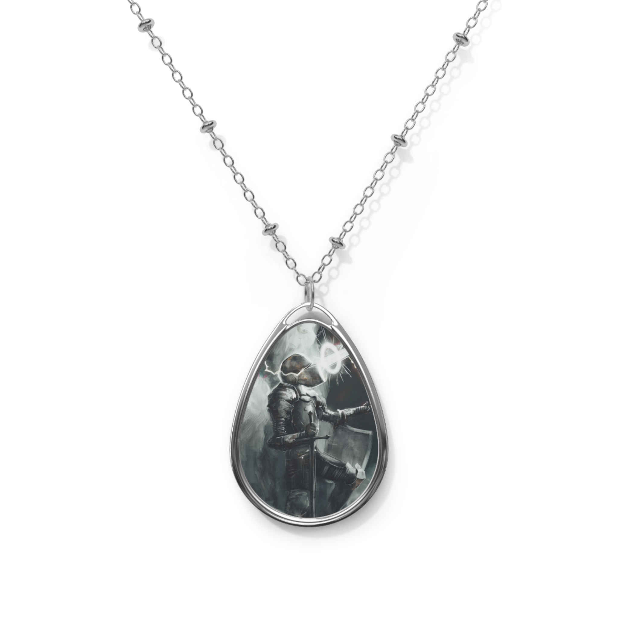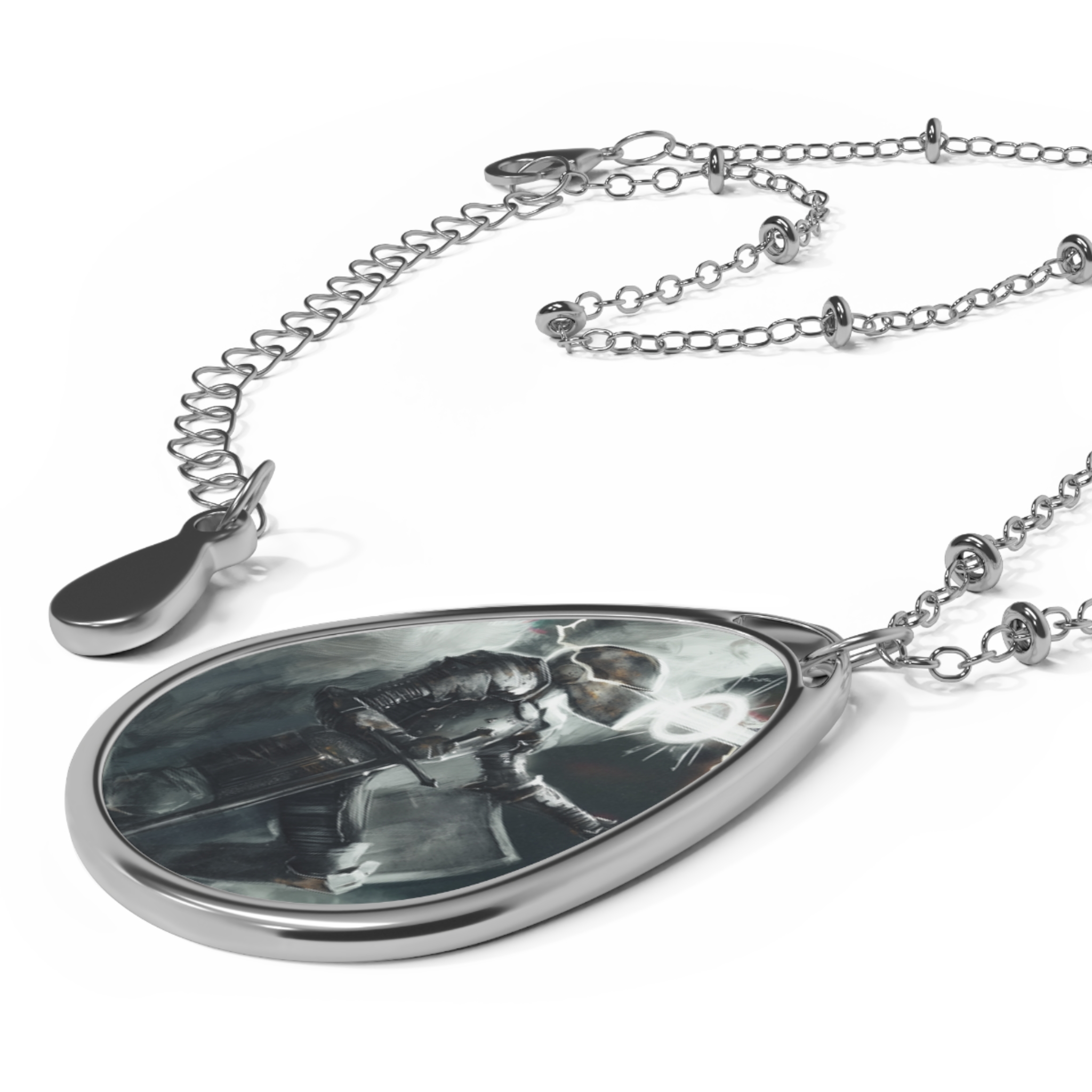 This delicate ellipse pendant brings art and memory into one wearable keepsake. The smooth white aluminum face captures vivid, glossy prints in bright, true-to-design color, while the polished zinc-alloy frame and chain lend quiet shine. Lightweight and comfortable, the pendant hangs from a refined chain with tiny bead accents and a secure lobster clasp so it sits confidently at the collarbone. Wear it layered with everyday jewelry or let it stand alone as a subtle statement that carries a personal image or small scene close to your heart.