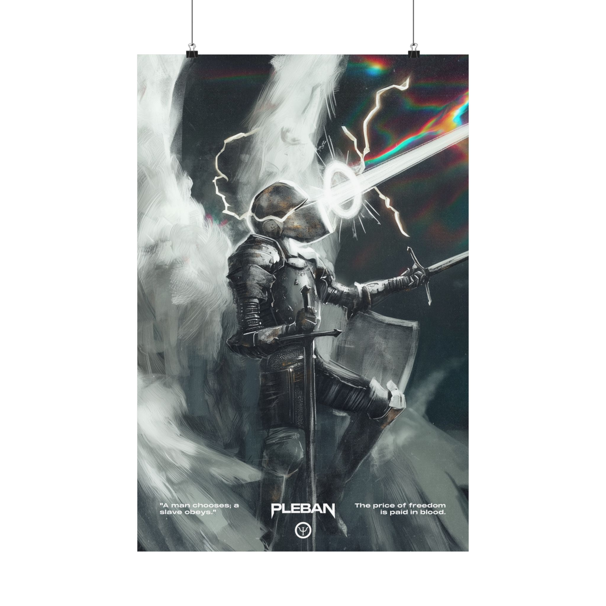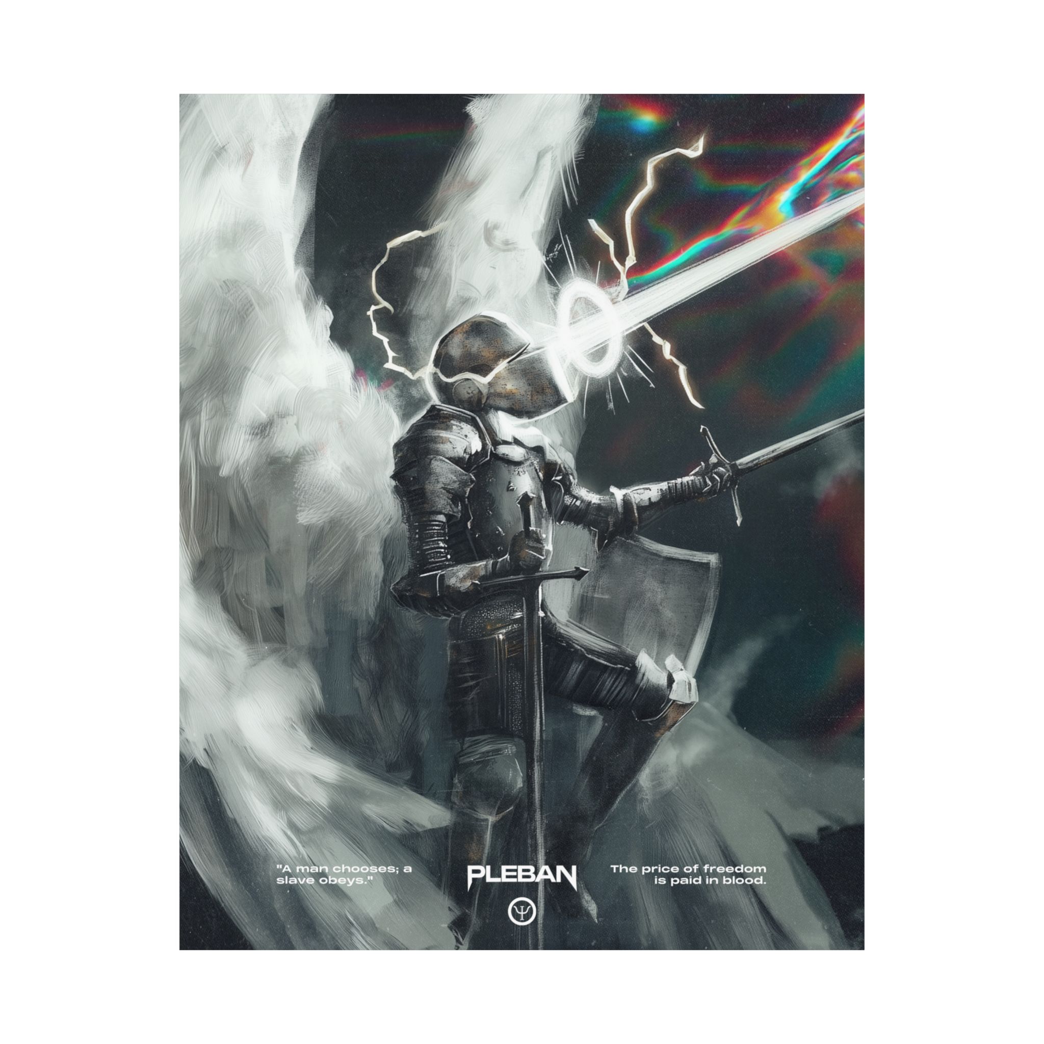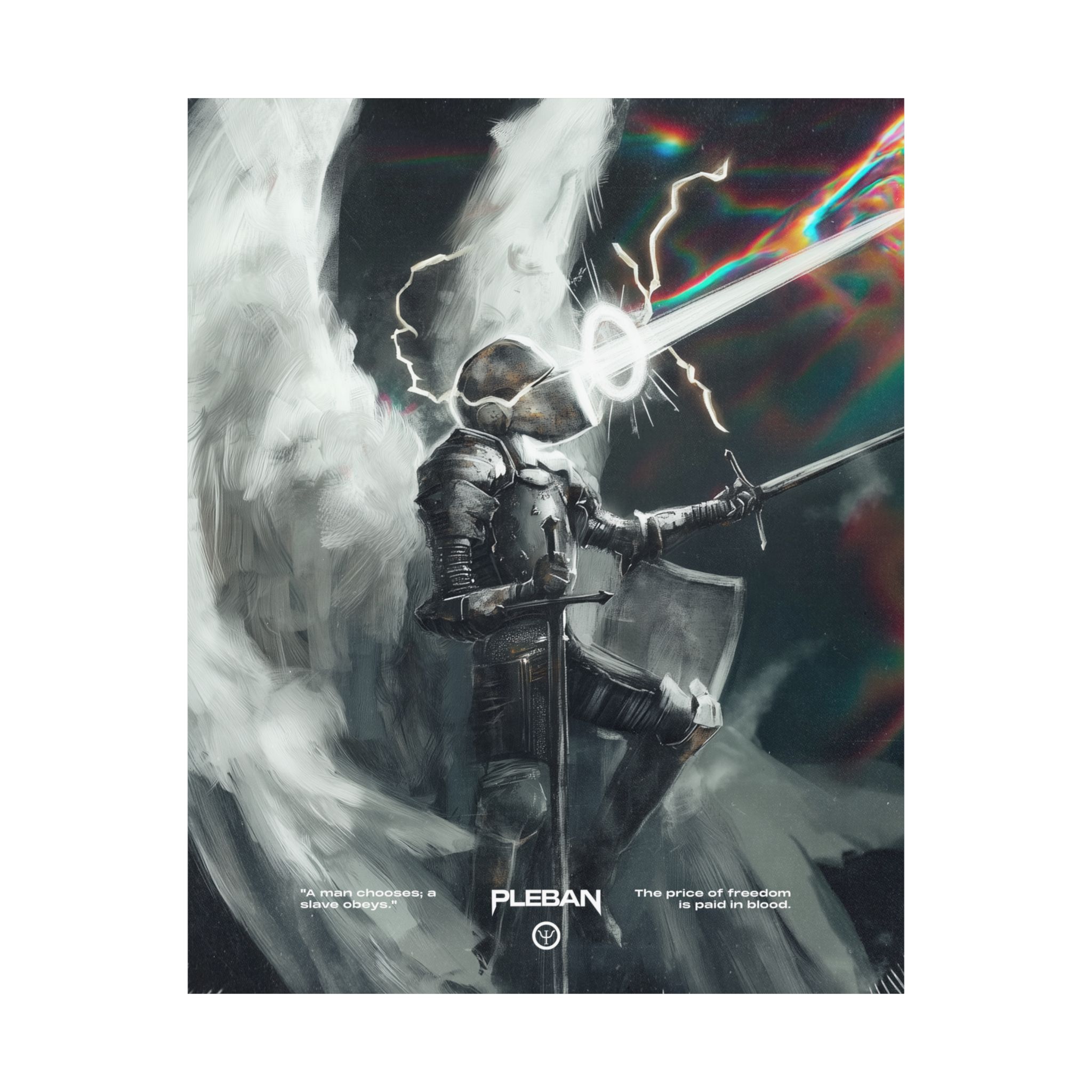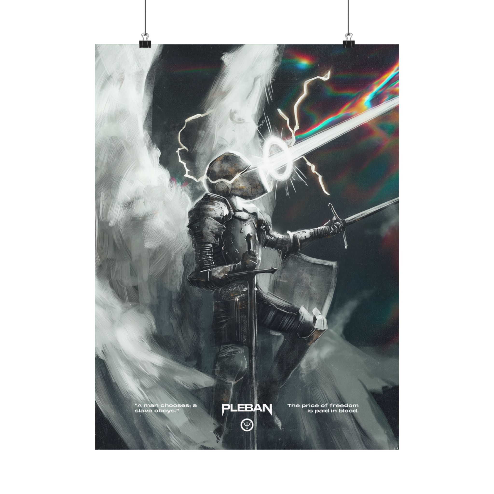 A dramatic, museum-quality matte poster that brings mythic intensity to any indoor space. Printed with archival Giclée inks on heavyweight, museum-grade paper, the artwork keeps contrast rich and tones true without glare. The composition—an armored angel bearing a lance beneath a spectral halo—creates a charged, cinematic atmosphere. Hung above a desk, in a studio, or on a gallery wall, this poster invites quiet focus and bold conversation. Sized across many options and produced to archival standards, it’s built to hang and age gracefully in your home or creative space.