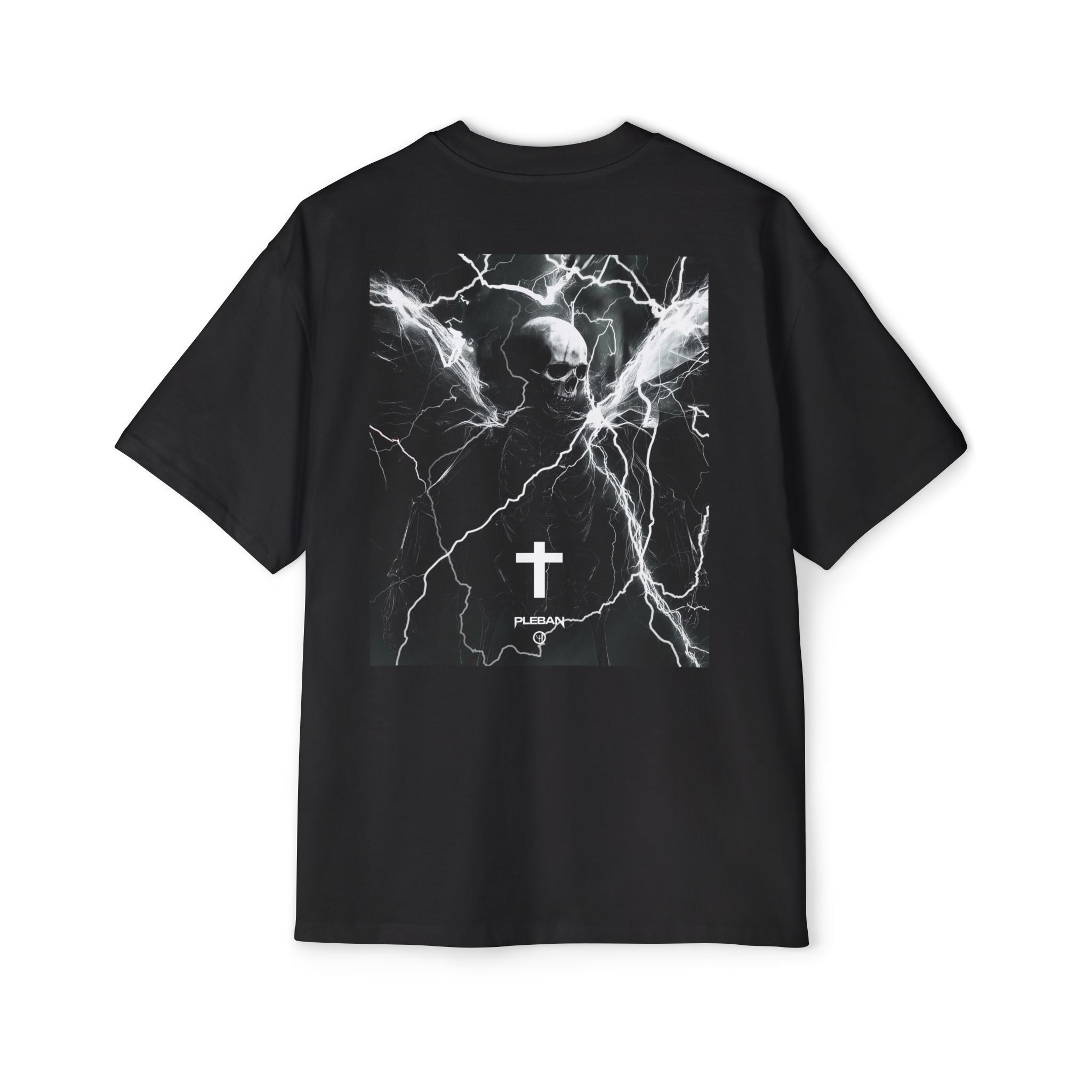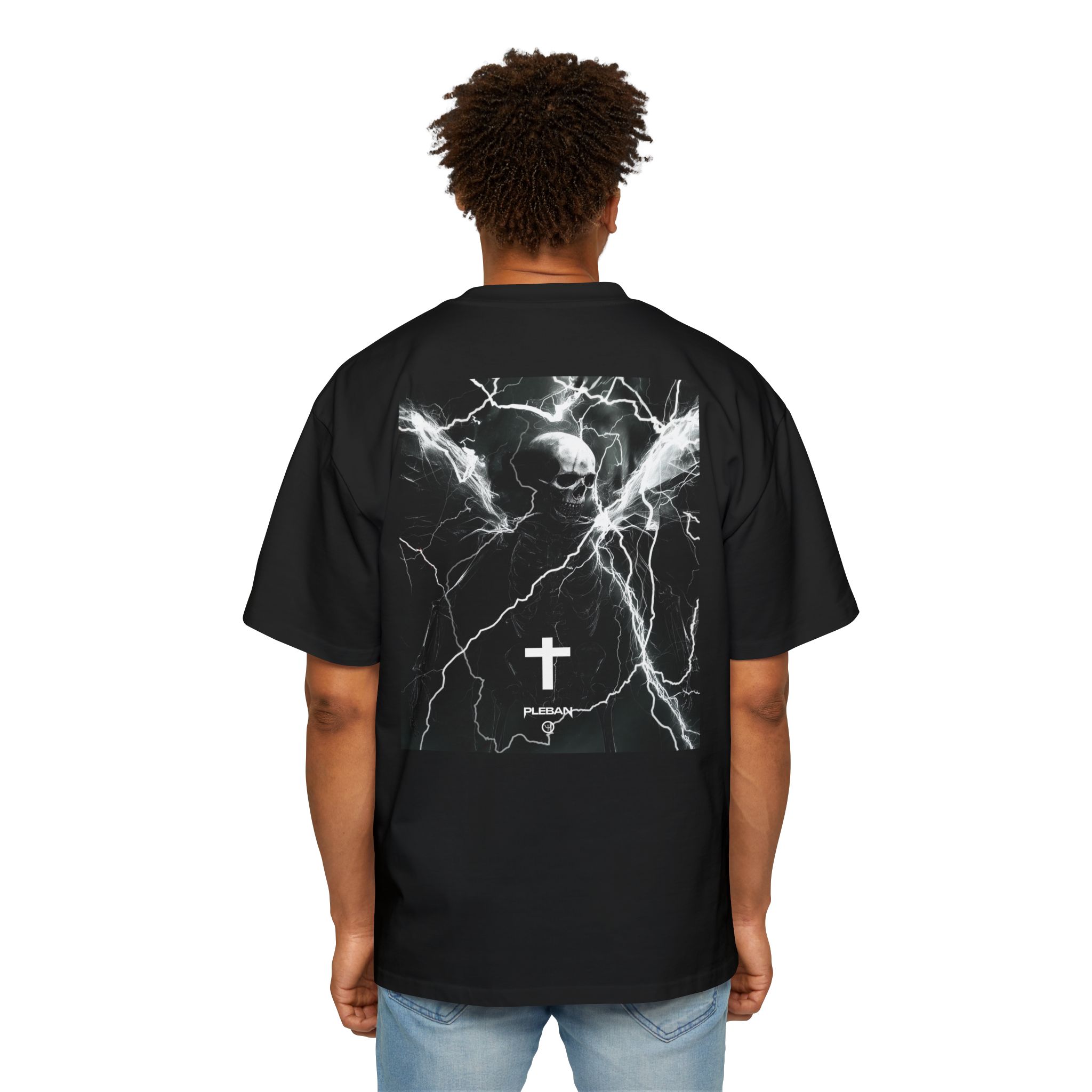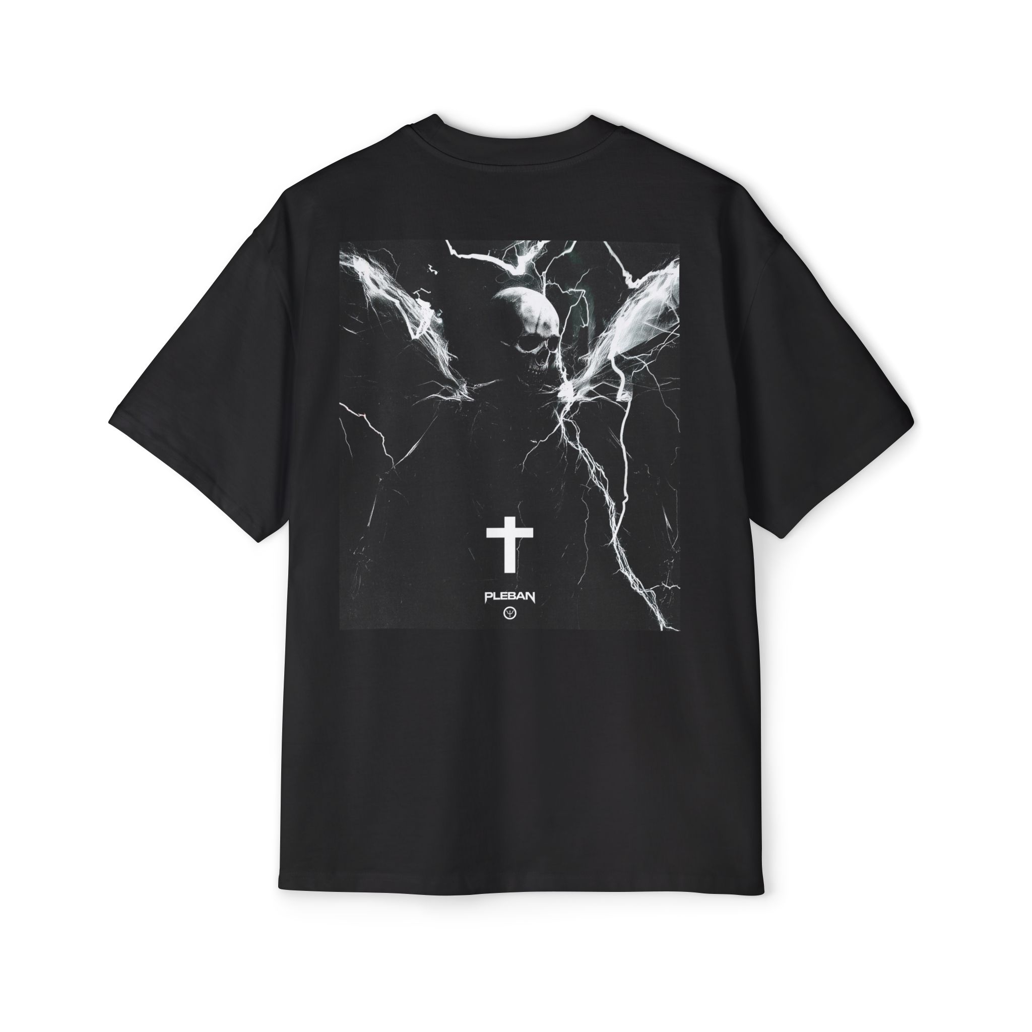 An oversized tee built for boldness — heavy-weight carded cotton that hangs with deliberate slouch and holds its shape. The front and back graphics lean into dark, stormy energy: a snarling skull, jagged lightning strikes and a stark inverted cross framed by the raw, blocky PLEBAN wordmark. It reads like a midnight mosh; worn loose over jeans or layered under a leather jacket, this shirt carries a charged, rebellious mood without shouting. The substantial fabric and reinforced stitching mean it wears like a lived-in favorite, not a fragile statement piece. If you move through underground shows, late-night city streets, or creative scenes that prize grit and attitude, this tee slips into that story and amplifies it.